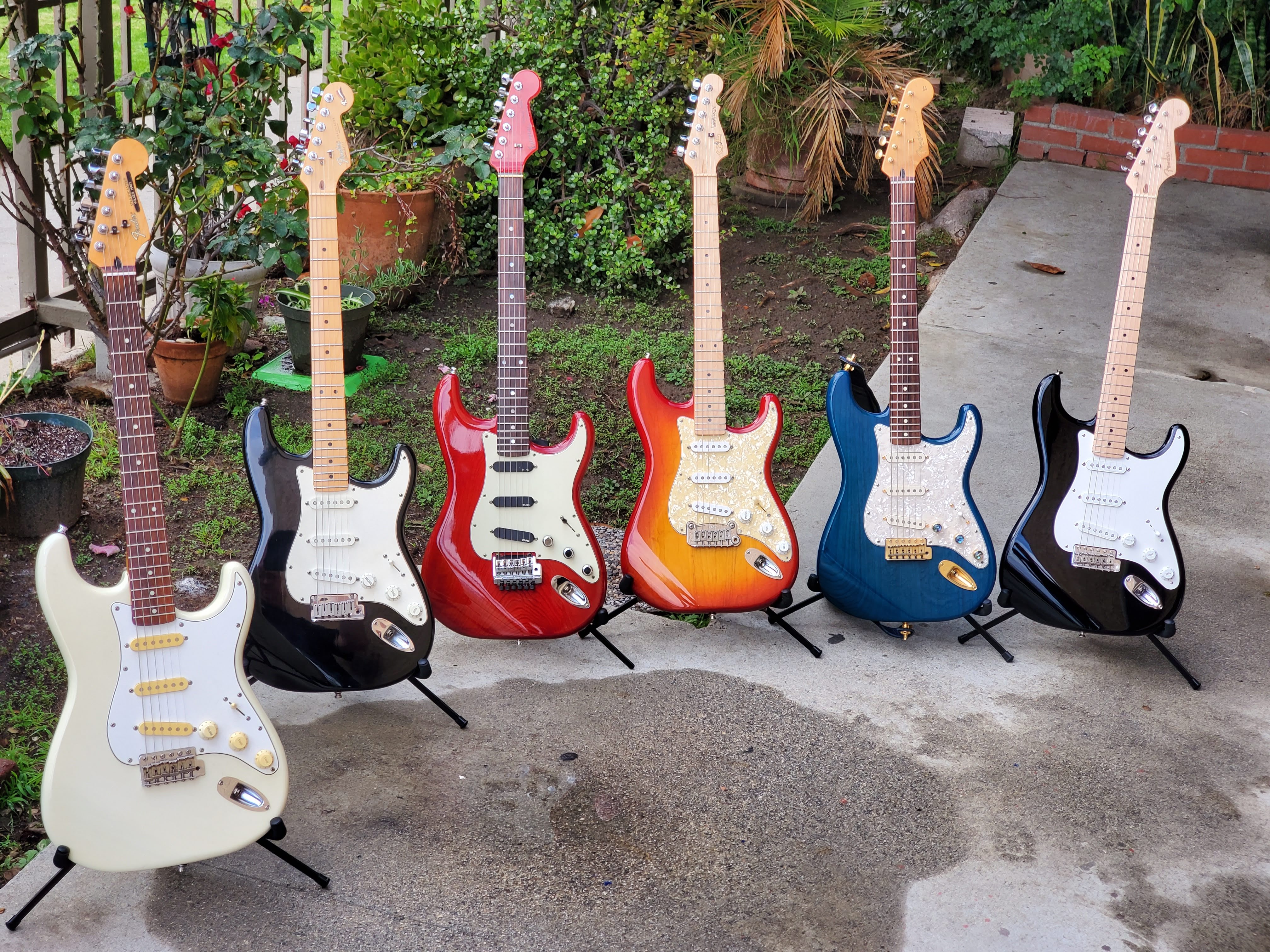 Stratocasters L-R: White 1981 “Volker Hast” Fender Stratocaster, Black Fender 1994 Anniversary Stratocaster, Red Roessel/Fairytale 1990 Savage (handmade), G&L 1996 Legacy, Sapphire Blue Transparent 2005 Fender DeLuxe Players Stratocaster, TR Guitars mod with DiMarzio Area Pickups, 2006 Fender Custom Shop “Blackie” Eric Clapton Stratocaster.